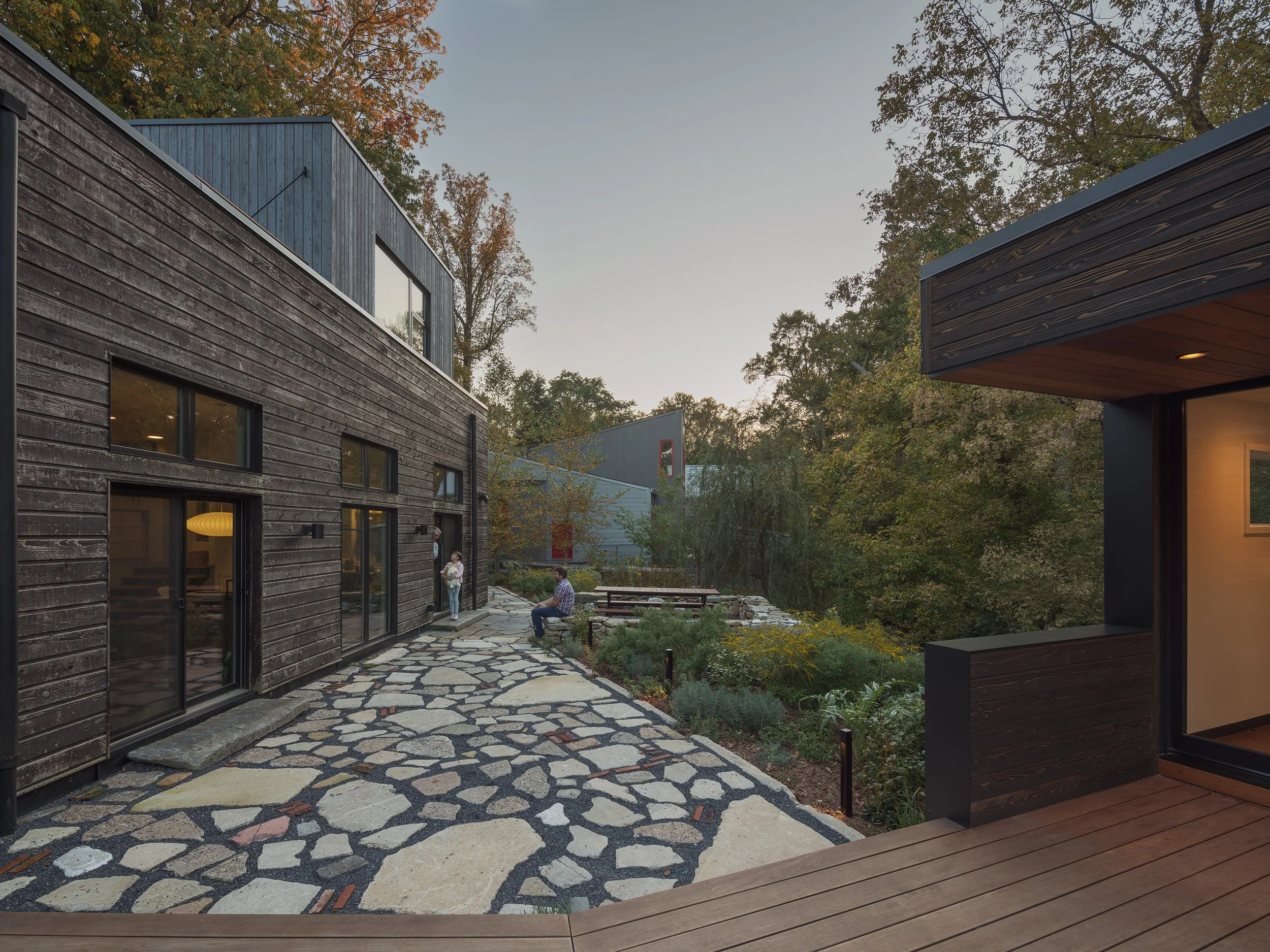 C2 designed the contemporary, high-performance Space Barn for a young family. Nicknamed by a neighbor who thought the house looked like a ‘barn from space,’ the house extends the length of the property to capture Wissahickon Park views from every room.