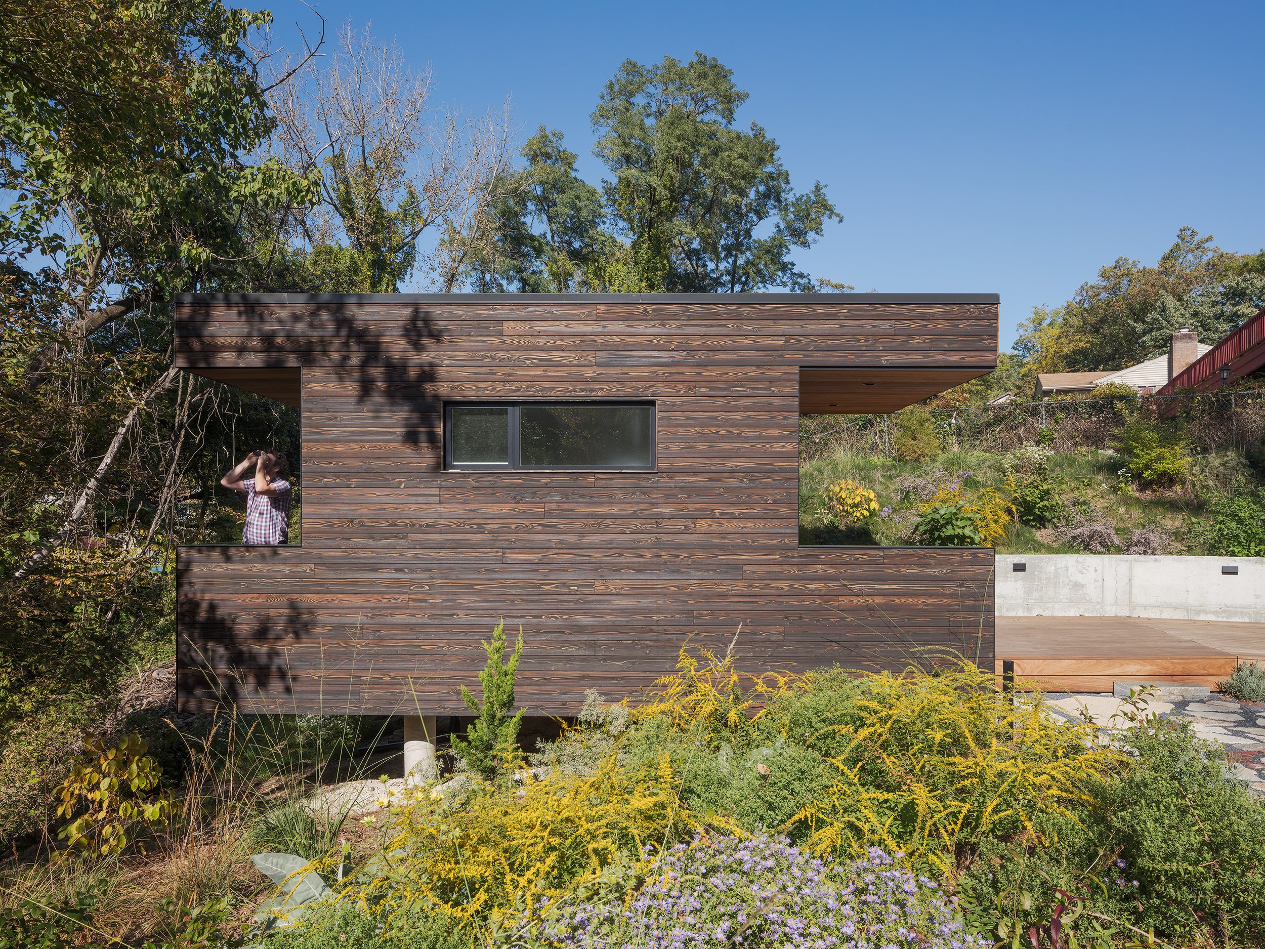 Two rectangular masses clad in Shou sugi ban charred siding align parallel to the park and street; these are connected by a third volume for circulation. Punched windows along the street-facing section of the house provide controlled views and privacy.